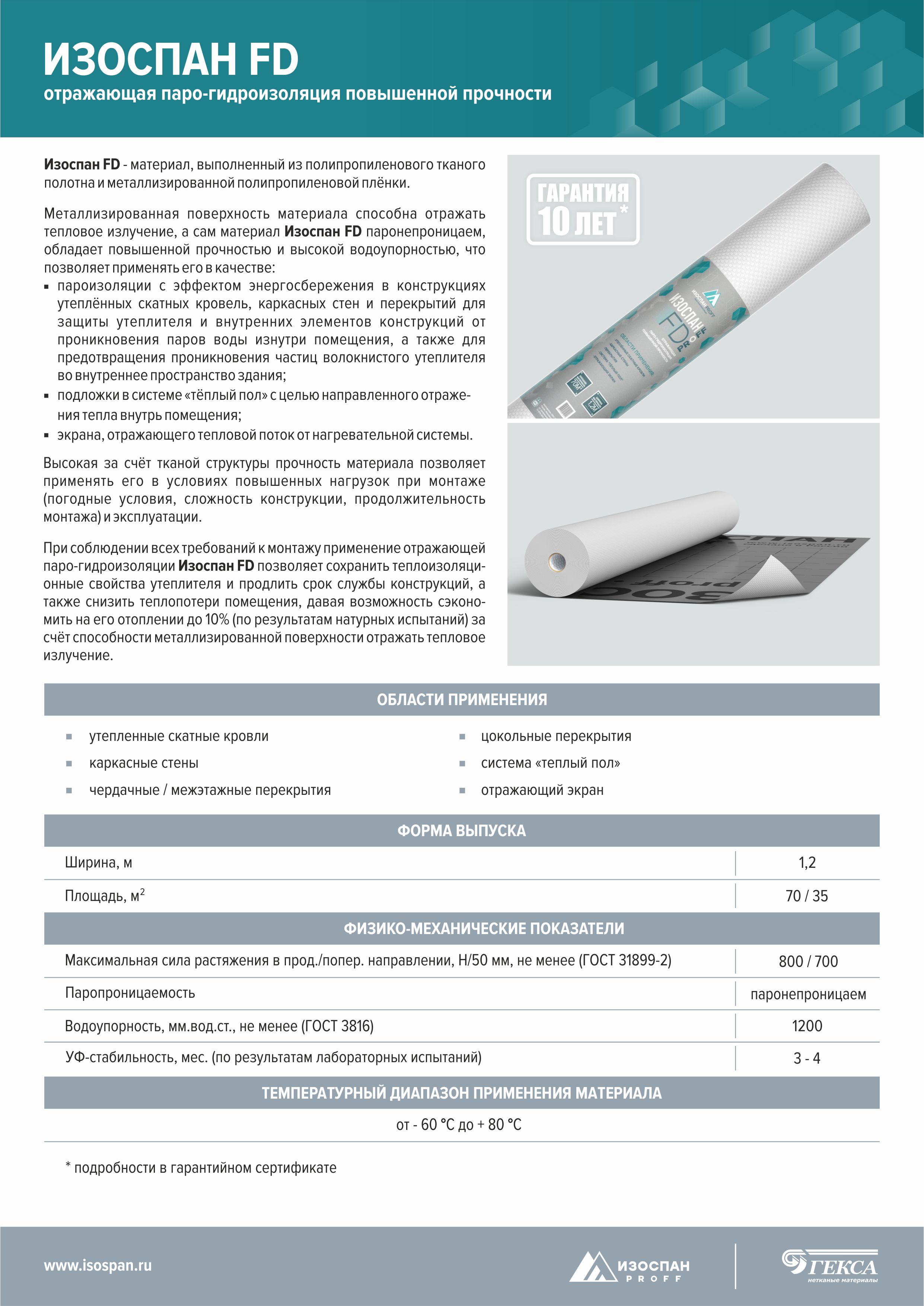 При соблюдении всех требований к монтажу применение отражающей паро-гидроизоляции Изоспан FD позволяет сохранить теплоизоляционные свойства утеплителя и продлить срок службы конструкций, а также снизить теплопотери помещения, давая возможность сэкономить на его отоплении до 10% (по результатам натурных испытаний) за счёт способности металлизированной поверхности отражать тепловое излучение.