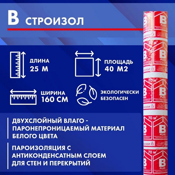 Строизол В - двухслойный влаго-паронепроницаемый материал белого цвета. Представляет собой пленку из полипропилена, нанесенную на основу из нетканого полотна методом плоскощелевой экструзии. Одна сторона материала гладкая, другая имеет волокнистую поверхность, предназначенную для удержания капель влаги и конденсата.