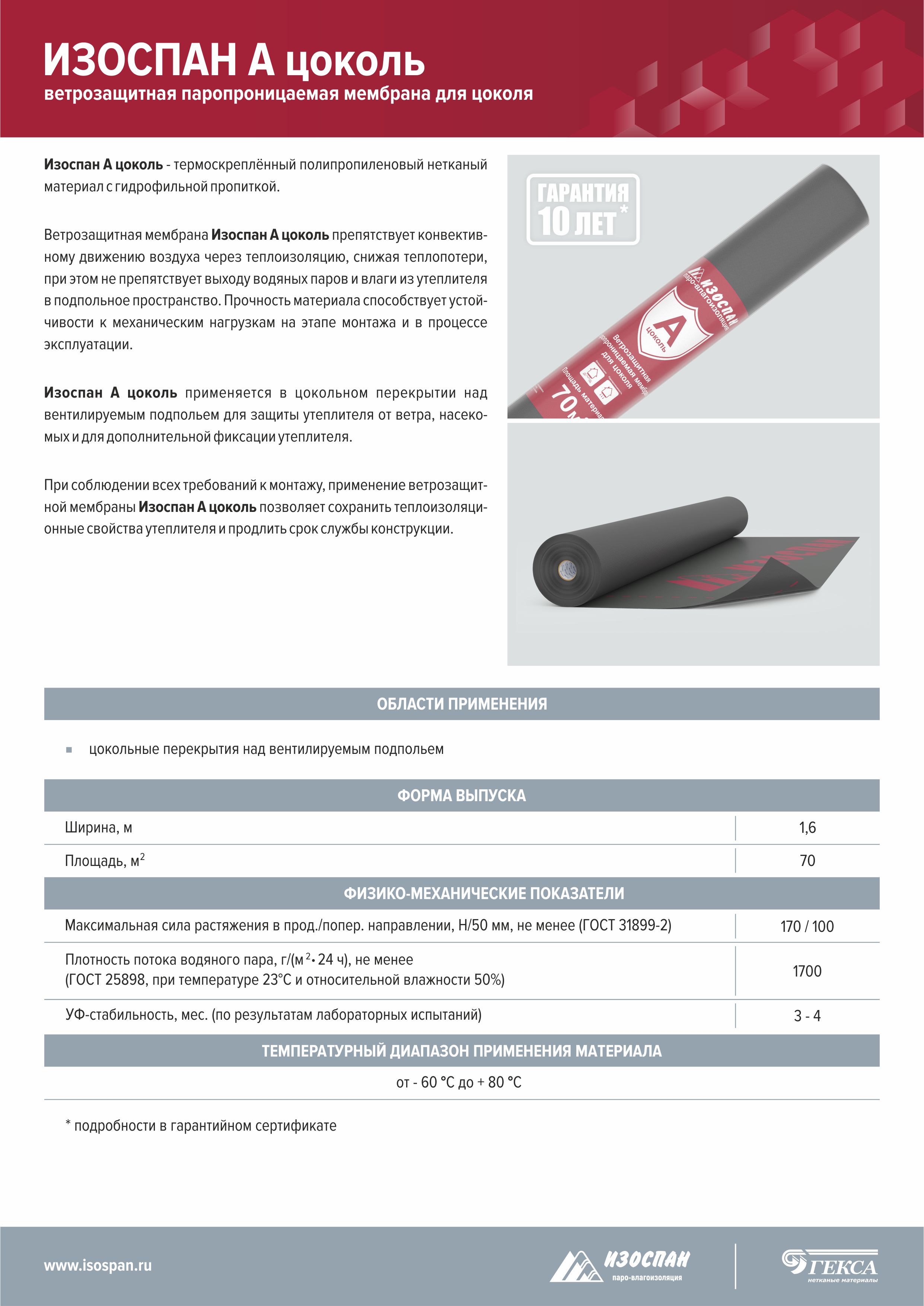 Ветрозащитная мембрана Изоспан А цоколь препятствует конвективному движению воздуха через теплоизоляцию, снижая теплопотери, при этом не препятствует выходу водяных паров и влаги из утеплителя в подпольное пространство. Прочность материала способствует устойчивости к механическим нагрузкам на этапе монтажа и в процессе эксплуатации. Изоспан А цоколь применяется в цокольном перекрытии над вентилируемым подпольем для защиты утеплителя от ветра, насекомых и для дополнительной фиксации утеплителя.
