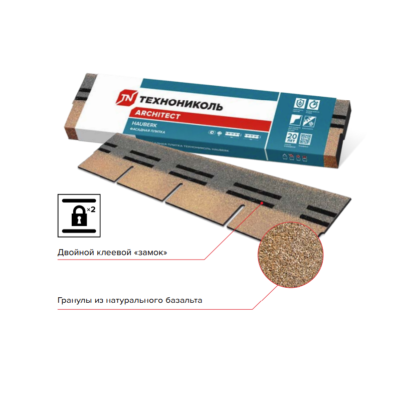 Фасадная плитка ТЕХНОНИКОЛЬ HAUBERK выполнена на основе стеклохолста и пропитана СБС-модифицированным битумом. Внешняя сторона материала покрыта базальтовым гранулятом, покрытие нижней стороны – кварцевый песок.